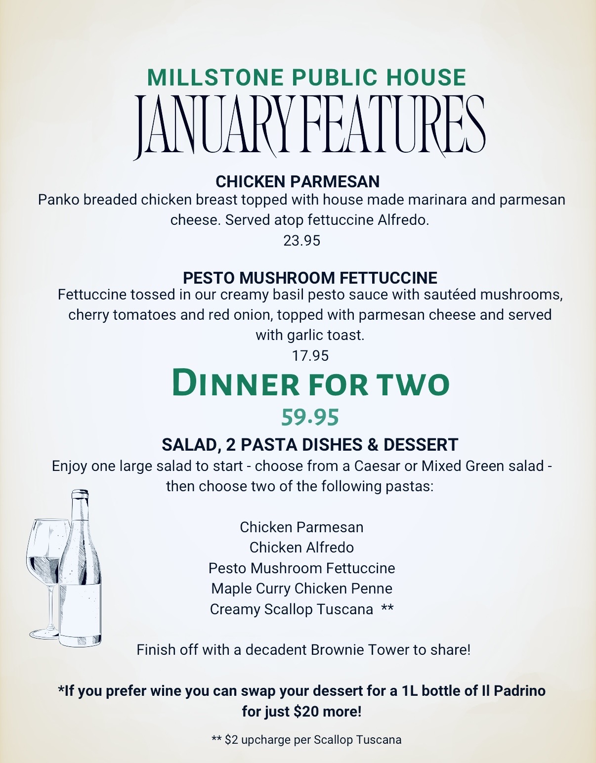 January calls for comfort food done right — the kind of dishes that warm you up, fill the table, and make winter feel a little more enjoyable. At The Millstone Public House, our January features are all about hearty pastas, rich sauces, and meals meant to be shared.